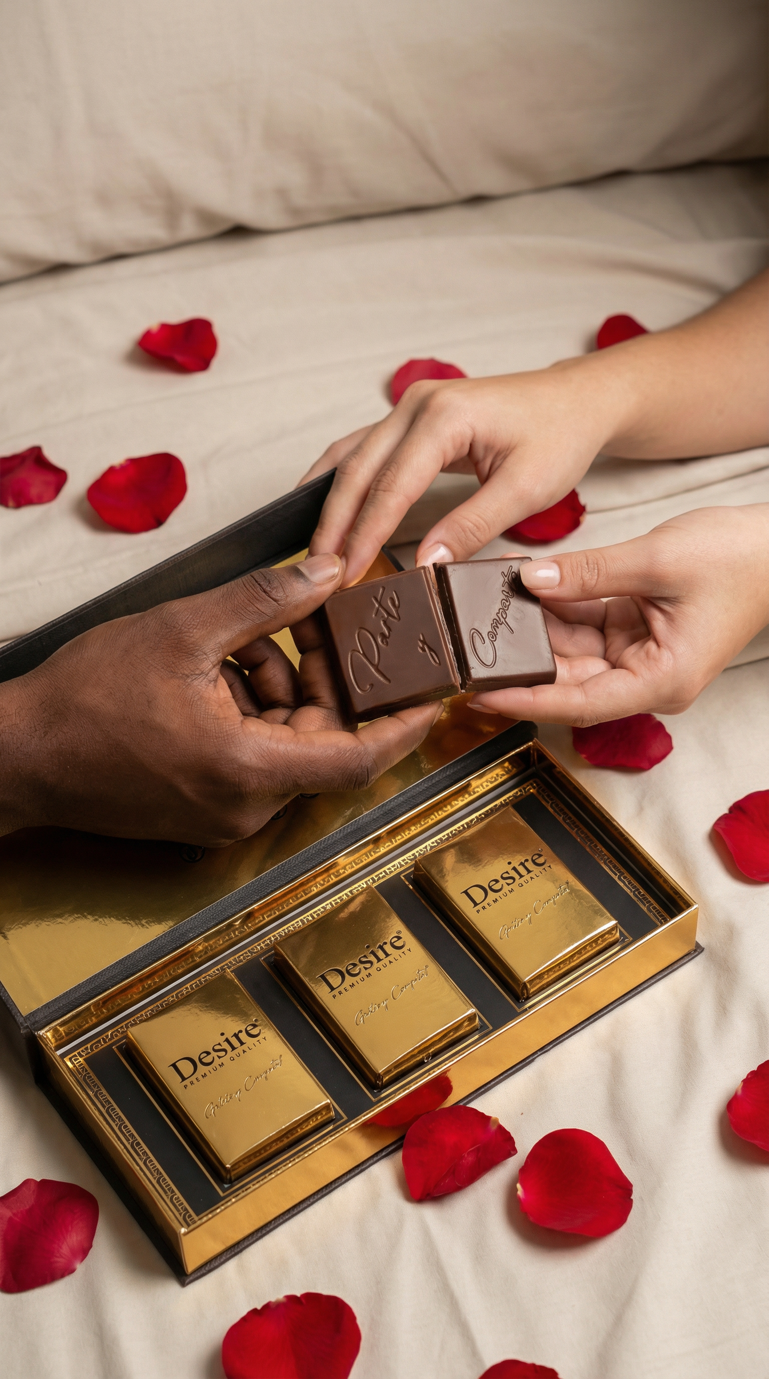 DESIRE CHOCOLATE es una experiencia sensorial que trasciende lo convencional. Con tres tabletas irresistibles en cada caja, nuestro chocolate no solo es delicioso, sino que envuelve tus sentidos de forma única. Disfruta media tableta para compartir con tu pareja o en solitario. Listo para acompañar tu velada en 45 minutos, ofreciéndote un momento de complicidad y placer sensorial.